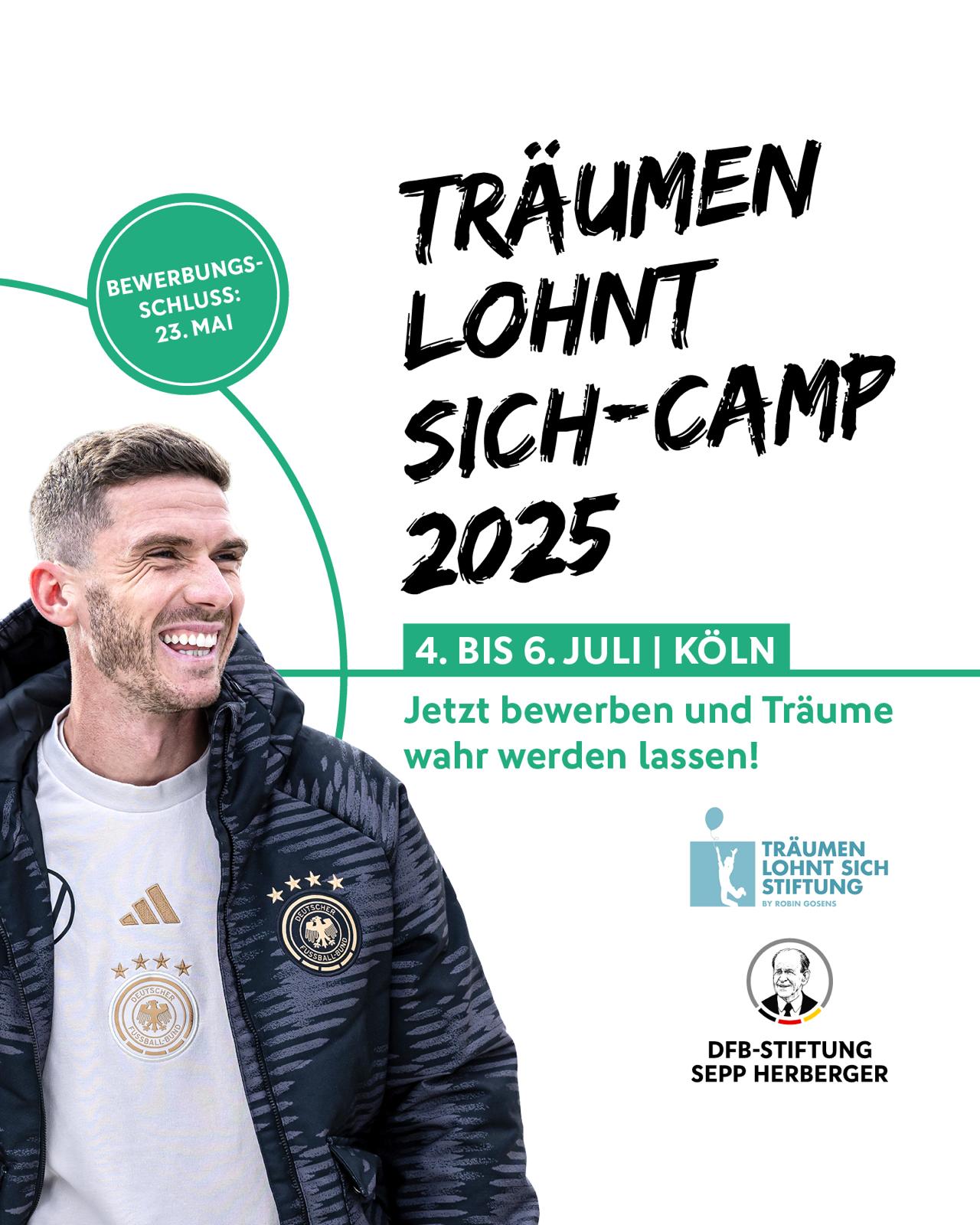 Die DFB-Stiftung Sepp Herberger veranstaltet gemeinsam mit der träumenlohntsich-Stiftung von Robin Gosens das Träumen lohnt sich-Camp. Zum ersten Mal findet die Veranstaltung in Köln statt. Vom 4. bis zum 6. Juli 2025 geht es in Sporteinheiten, Workshops und Impulsvorträgen um Themen für Nachwuchstalente, die sich vorrangig im Kopf abspielen.